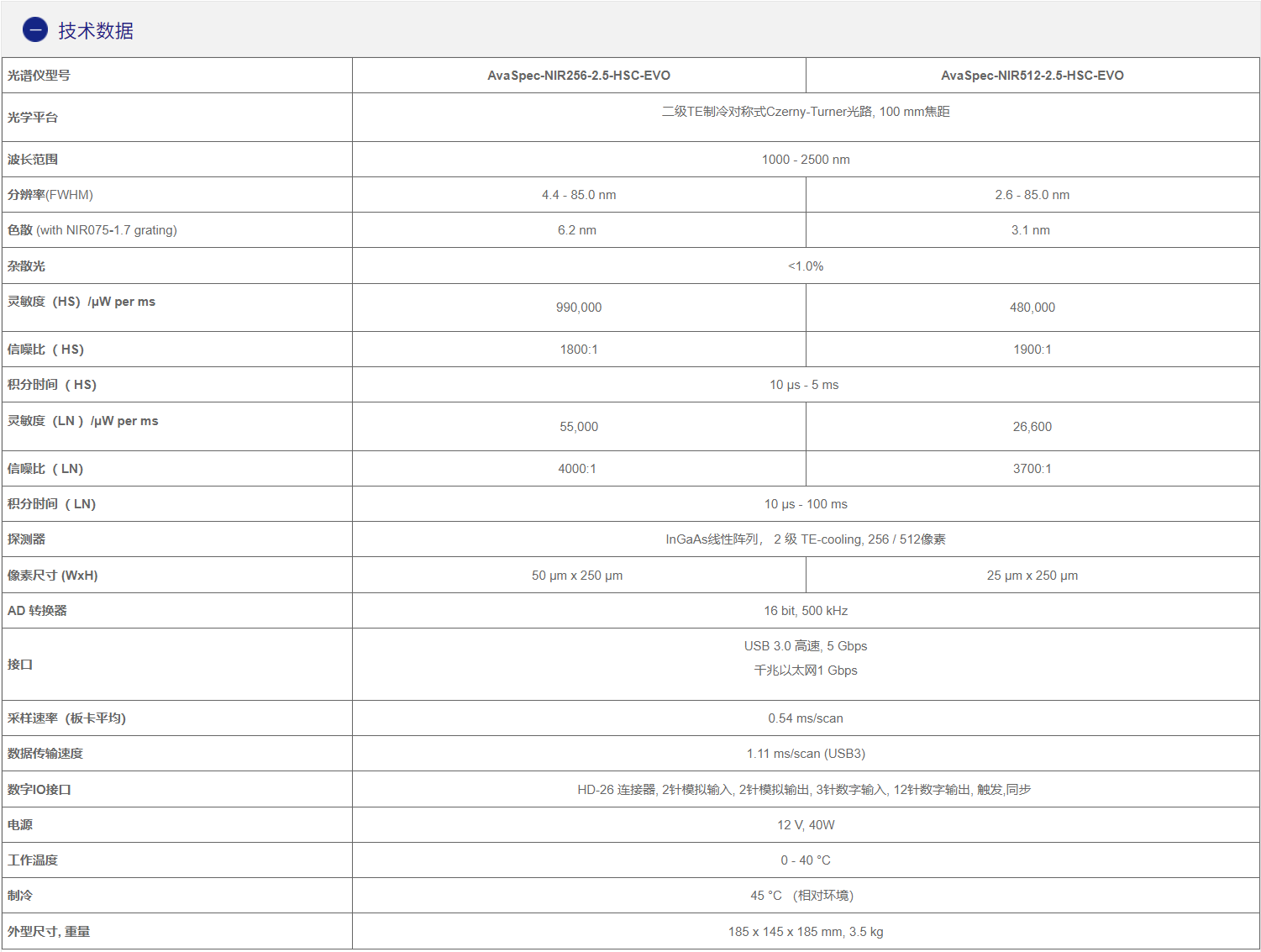 NIR256/512-2.5-HSC-EVO光谱仪采用带二级制冷的专门用于近红外的InGaAs探测器,可通过USB3.0接口与计算机连接,数据传输速度为1.11ms。该光谱仪标配软件,操作手册和USB/电源线。NIR256/512-2.5-HSC-EVO光谱仪都配有可更换狭缝,使其配置的灵活性大大提高。