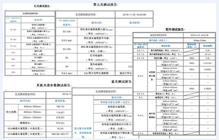 • YY/T 1496-2016 《红光治疗设备》: 有效红光辐照度 、 均匀性 、 不稳定度 、 辐射光谱 、 紫外辐射 、红外辐射 、 电源电压波动的测试 、一键生成红光测试报告。